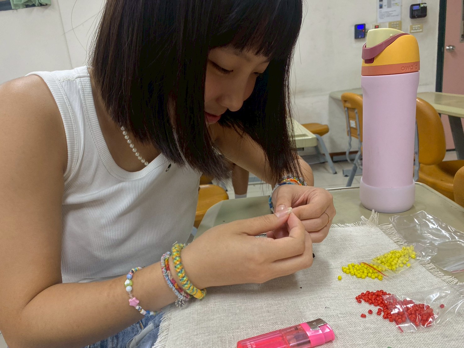 在實作過程中,洪老師示範編織與裝飾技巧,並逐步解說每個工序的重點與細節。學生從挑選材料、設計紋飾到完成作品,每個步驟都能感受到手作的耐心與精緻。透過實際操作,學生不僅創作出具有文化特色的作品,也理解傳統工藝如何在現代生活中延續與創新。