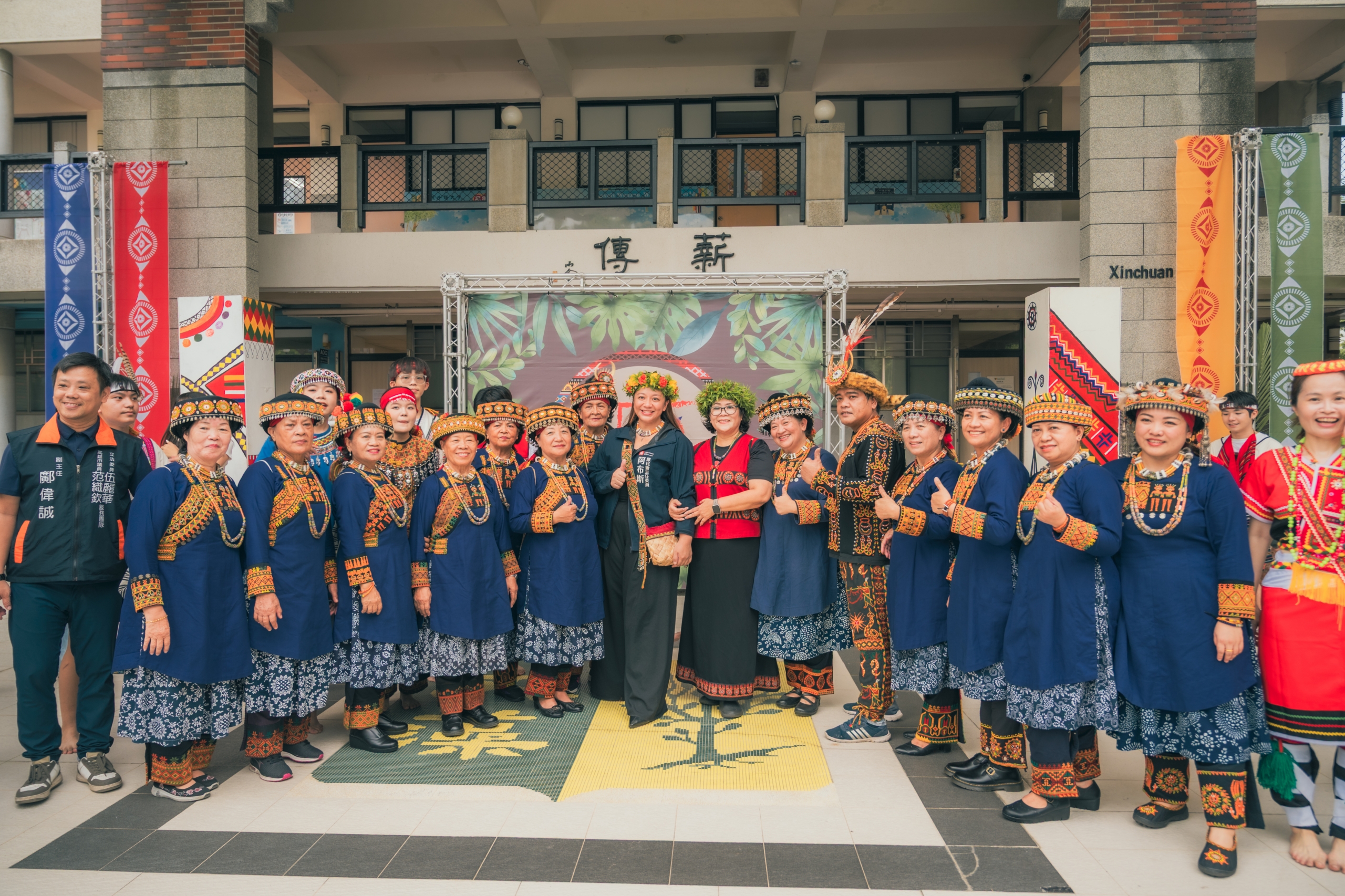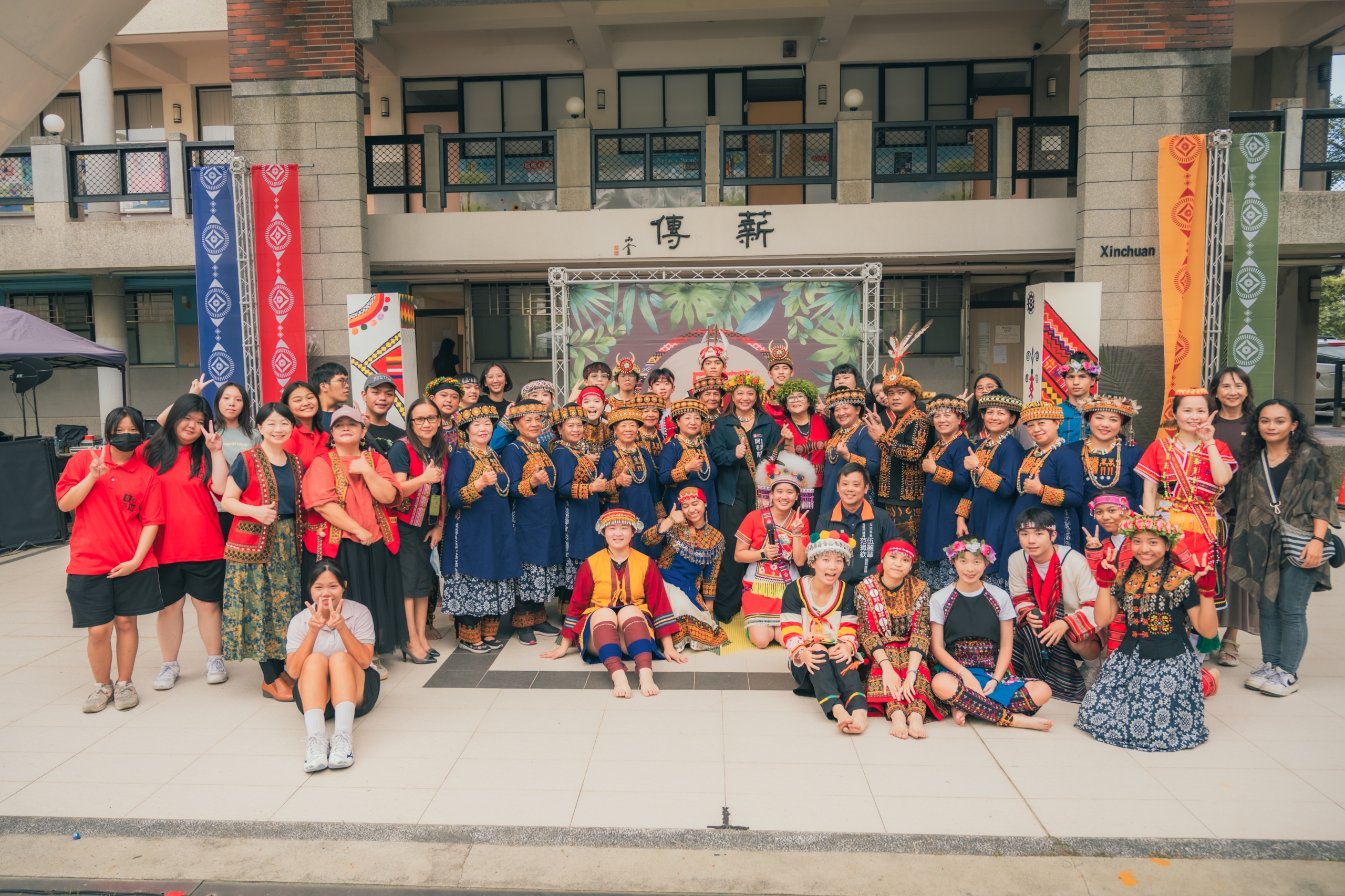 文藻外大原民周開幕式邀屏東佳興古謠隊以排灣族祈福與古調揭幕,展現原民文化之美。圖為古謠隊與文藻表演團隊合影。相片攝影/公關室