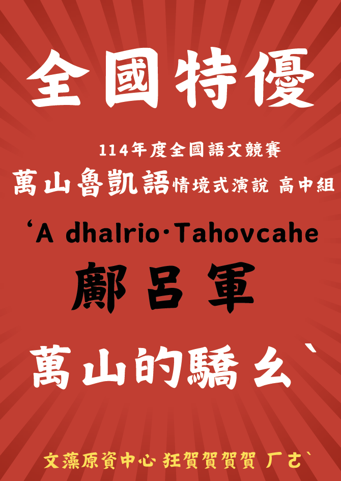 賀!學生'Adhalrio•Tahovecahe鄺O軍獲「114年度全國語文競賽萬山魯凱語情境式演說—全國特優」!