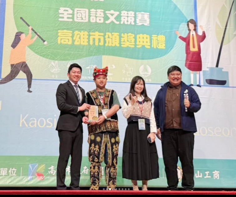 本校五專部西班牙語文科二年級學生鄺O軍(’Adhalrio・Tahovecahe)連續兩年代表高雄市參加全國語文競賽,於「114年度全國語文競賽」—萬山魯凱族語情境式演說高中組榮獲全國特優,展現卓越語言能力與文化素養。